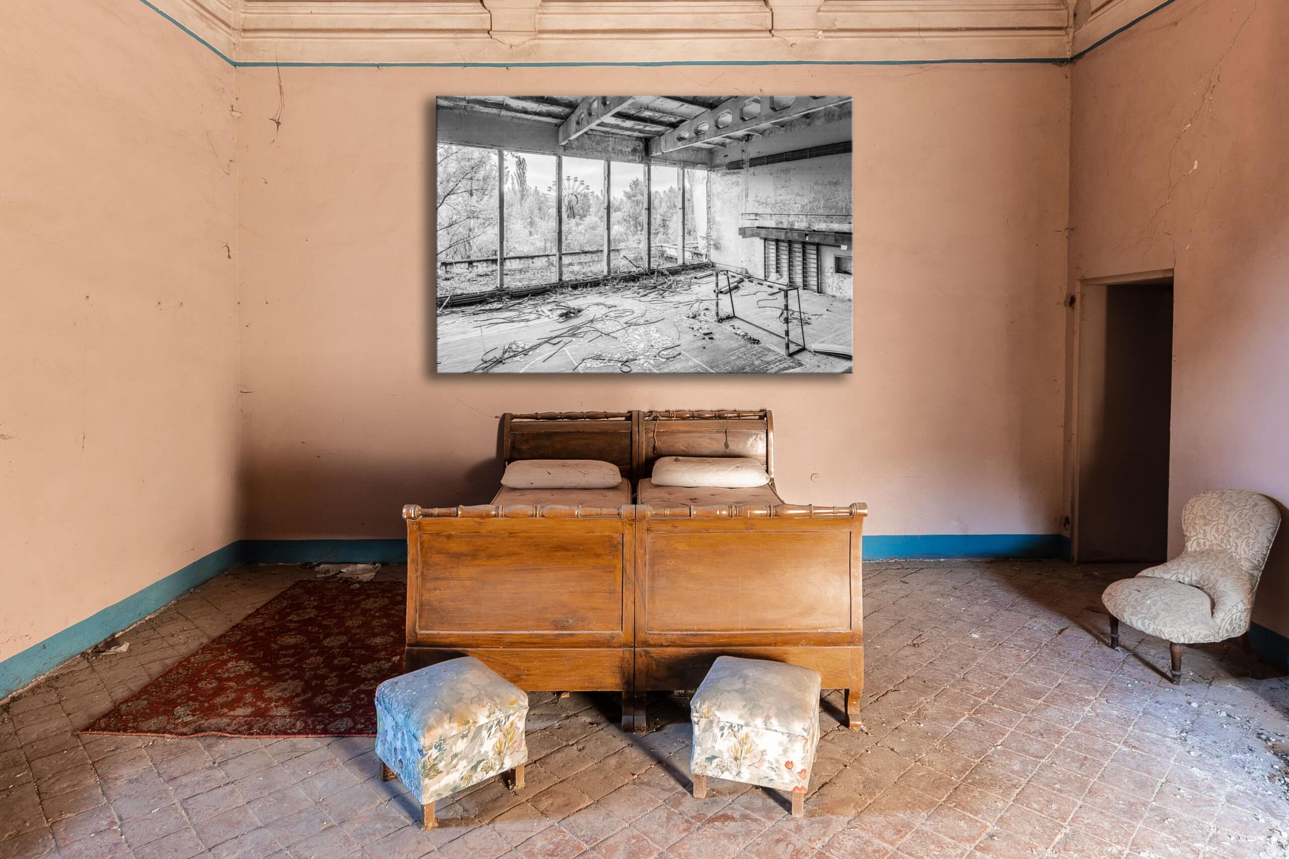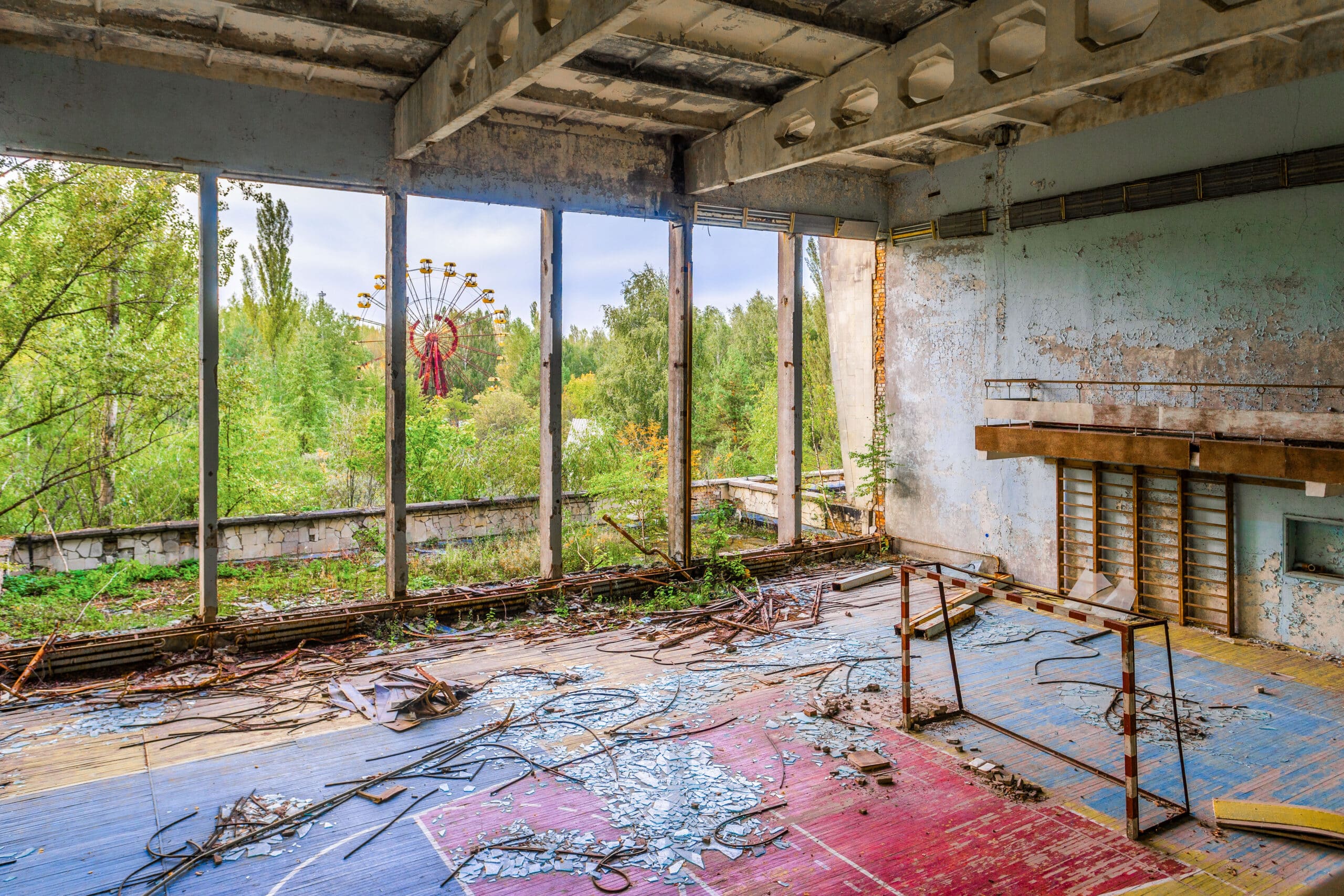 Nach der Reaktorkatastrophe von Tschernobyl am 26. April 1986 blieb die Halle, wie die gesamte Stadt, abrupt zurückgelassen. Glasscherben, rostende Tore und die sich ausbreitende Vegetation erzählen heute vom unaufhaltsamen Lauf der Zeit.