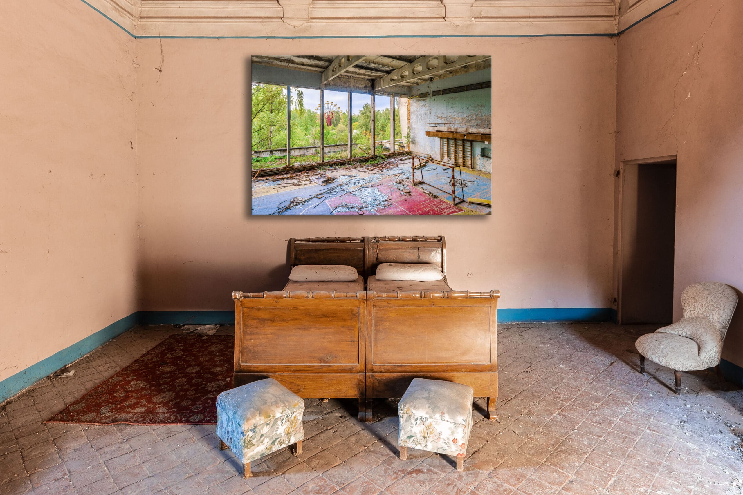 Dieses Bild zeigt die verlassene Sporthalle von Prypjat, einer Stadt, die einst voller Leben und Hoffnung war. Hier trainierten Kinder, Jugendliche und Sportvereine – die bunten Linien des Spielfelds zeugen noch von Handball- und Basketballspielen, während draußen im Hintergrund das berühmte Riesenrad des Prypjater Vergnügungsparks zu sehen ist.