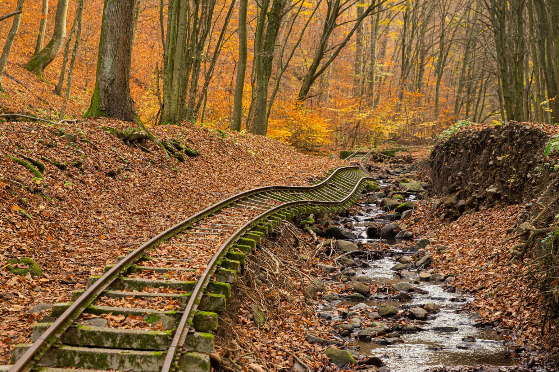 Unser Exponat führt uns in das Csarna-Tal, tief hinein in den Wald von Börzsöny, einem Teil des nördlichen ungarischen Mittelgebirges im Karpatenvorland. Vor uns liegen die Schienen einer Schmalspurbahn, 1913 entlang des Csarna-Bachs erbaut, mit nur 600 Millimetern Spurweite und einer Länge von neun Kilometern, die einst Kemence mit Királyháza verband. Diese Bahnlinie diente dem Transport von Holz und verknüpfte mehrere Sägewerke miteinander. Zunächst wurden die Wagen ausschließlich von Kutschen gezogen, bis 1947 die erste Motorlokomotive über die Gleise rollte. Mit dem Rückgang der Aufträge nach dem Zweiten Weltkrieg verlor die Strecke ihre Bedeutung, Schienen und Gebäude wurden nach und nach abgetragen, und 1990 kam der Holztransport schließlich vollständig zum Erliegen.