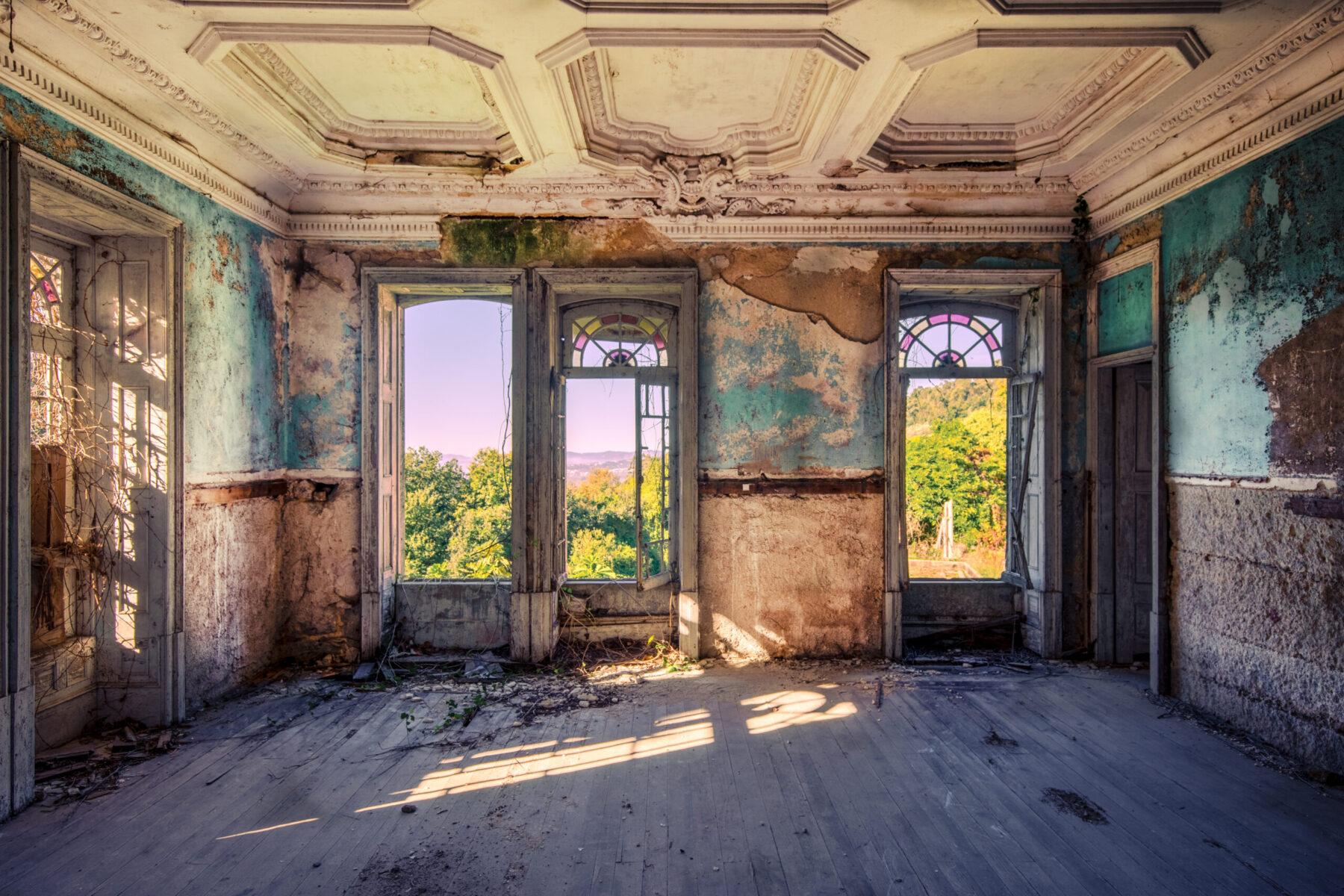 Dieser Ort ist leider ein kleines Mysterium. Ich konnte bis Heute nichts über die Geschichte des Anwesens erfahren. Das Haus besitzt den Spitznamen „Haus der Träume“. Vermutlich wurde es Anfang des 20. Jahrhunderts erbaut. Das Haus besitzt einige Jugendstil-Elemente , wie auf dem Bild zu erkennen ist. Generell ist das Gebäude voller Details, nicht nur die Decken, sondern auch die Türen, Treppen usw. Der Besuch war lebensgefährlich. Viele Gebäude in Portugal sind größtenteils aus Holz errichtet, und daher meist sehr einsturzgefährdet. Auch hier mussten wir vorsichtig auf Balken balancieren.